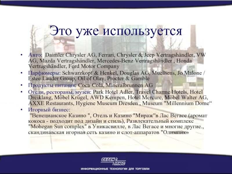 "Венецианское Казино ", Отель и Казино "Мираж"в Лас Вегасе (аромат кокоса - подходит под дизайн и стиль), Развлекательный комплекс "Mohegan Sun complex" в Уникасвилле, в Лас Вегасе и многие другие., скандинавская игорная сеть казино и слот-аппаратов "Олимпик»