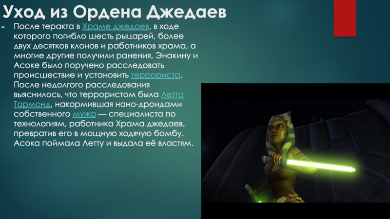 шесть рыцарей, более двух десятков клонов и работников храма, а многие другие получили ранения, Энакину и Асоке было поручено расследовать происшествие и установить террориста. После недолгого расследования выяснилось, что террористом была Летта Тармонд, накормившая нано-дроидами собственного мужа — специалиста по технологиям, работника Храма джедаев, превратив его в мощную ходячую бомбу. Асока поймала Летту и выдала её властям.