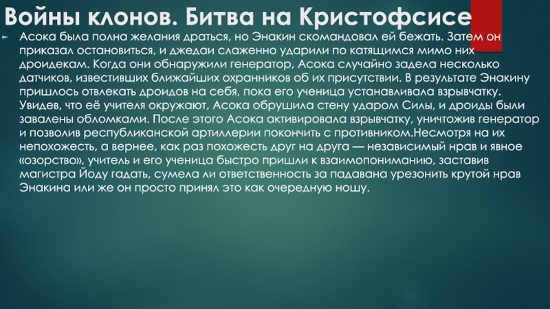 скомандовал ей бежать. Затем он приказал остановиться, и джедаи слаженно ударили по катящимся мимо них дроидекам. Когда они обнаружили генератор, Асока случайно задела несколько датчиков, известивших ближайших охранников об их присутствии. В результате Энакину пришлось отвлекать дроидов на себя, пока его ученица устанавливала взрывчатку. Увидев, что её учителя окружают, Асока обрушила стену ударом Силы, и дроиды были завалены обломками. После этого Асока активировала взрывчатку, уничтожив генератор и позволив республиканской артиллерии покончить с противником.Несмотря на их непохожесть, а вернее, как раз похожесть друг на друга — независимый нрав и явное «озорство», учитель и его ученица быстро пришли к взаимопониманию, заставив магистра Йоду гадать, сумела ли ответственность за падавана урезонить крутой нрав Энакина или же он просто принял это как очередную ношу.