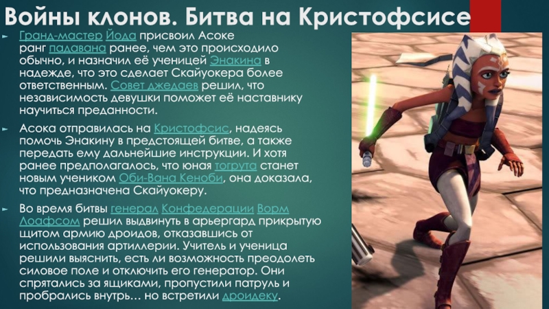Асока отправилась на Кристофсис, надеясь помочь Энакину в предстоящей битве, а также передать ему дальнейшие инструкции. И хотя ранее предполагалось, что юная тогрута станет новым учеником Оби-Вана Кеноби, она доказала, что предназначена Скайуокеру.