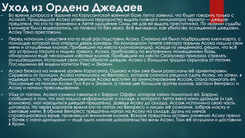 базе Летта заявила, что будет говорить только с Асокой. Пришедшая Асока уговорила террористку выдать главного инициатора теракта — джедая-предателя. Но кто-то применил к Летте удушение Силы, не дав ей выдать преступника. По иронии судьбы в камере была видеозапись, но почему-то без звука. Всё выглядело, как убийство осужденной джедаем. Асоку Тано арестовали.