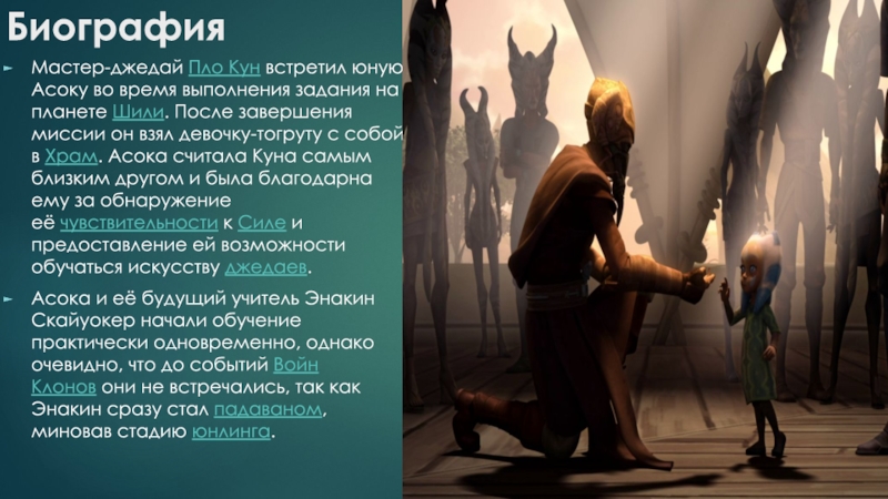 Мастер-джедай Пло Кун встретил юную Асоку во время выполнения задания на планете Шили. После