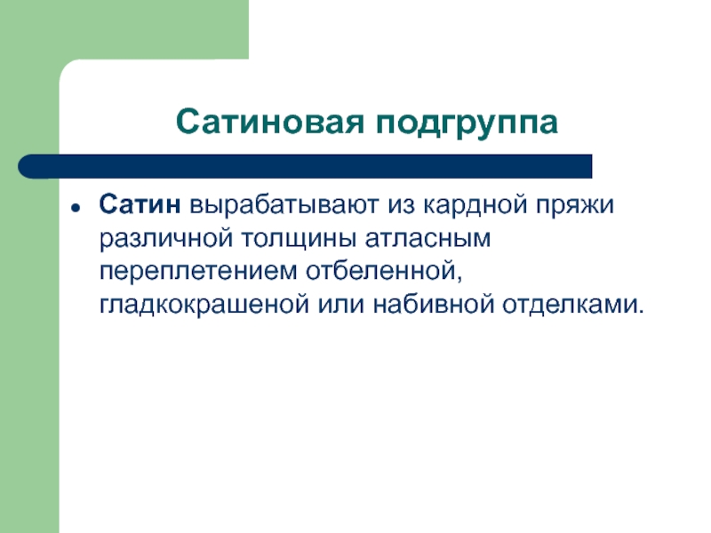 Сатин вырабатывают из кардной пряжи различной толщины атласным переплетением отбеленной,