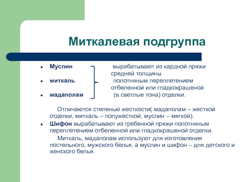 Отличаются степенью жесткости( мадаполам – жесткой отделки, миткаль – полужесткой, муслин – мягкой).