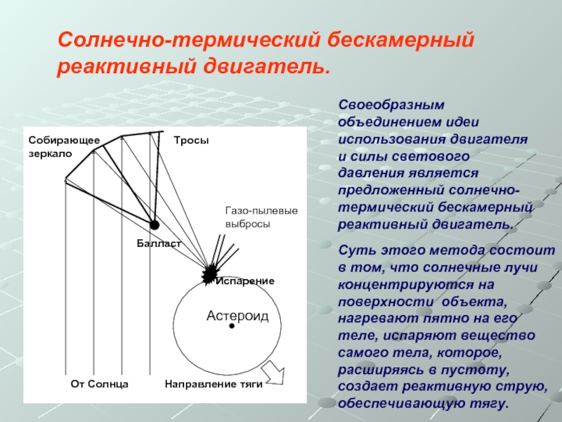 Суть этого метода состоит в том, что солнечные лучи концентрируются на поверхности объекта, нагревают пятно на его теле, испаряют вещество самого тела, которое, расширяясь в пустоту, создает реактивную струю, обеспечивающую тягу.