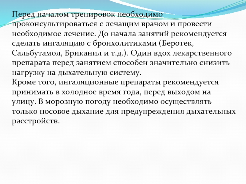 лечение. До начала занятий рекомендуется сделать ингаляцию с бронхолитиками (Беротек, Сальбутамол, Бриканил и т.д.). Один вдох лекарственного препарата перед занятием способен значительно снизить нагрузку на дыхательную систему.