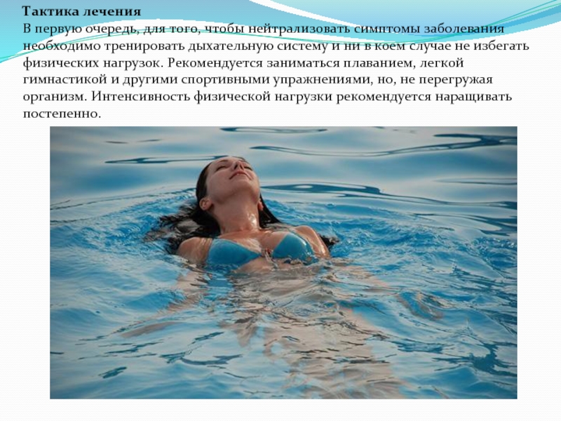тренировать дыхательную систему и ни в коем случае не избегать физических нагрузок. Рекомендуется заниматься плаванием, легкой гимнастикой и другими спортивными упражнениями, но, не перегружая организм. Интенсивность физической нагрузки рекомендуется наращивать постепенно.