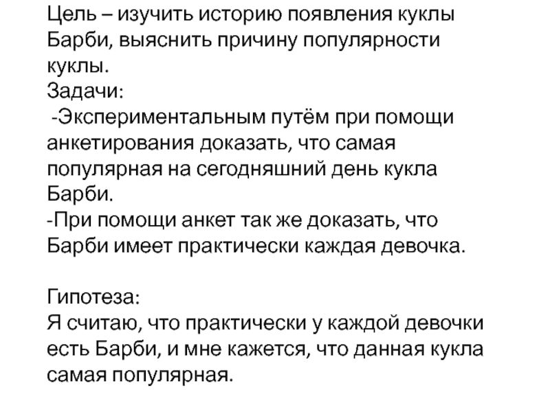 Цель – изучить историю появления куклы Барби, выяснить причину популярности куклы.