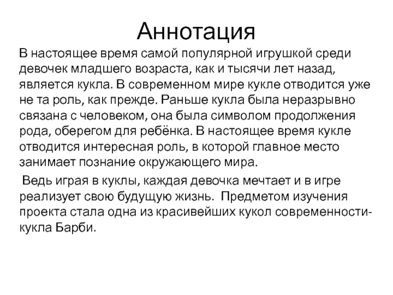 Ведь играя в куклы, каждая девочка мечтает и в игре реализует свою будущую жизнь. Предметом изучения проекта стала одна из красивейших кукол современности-кукла Барби.