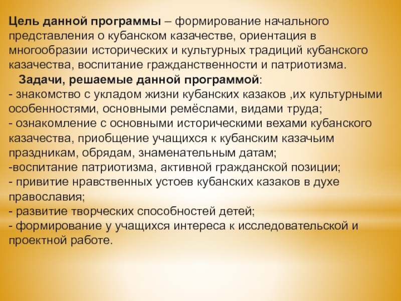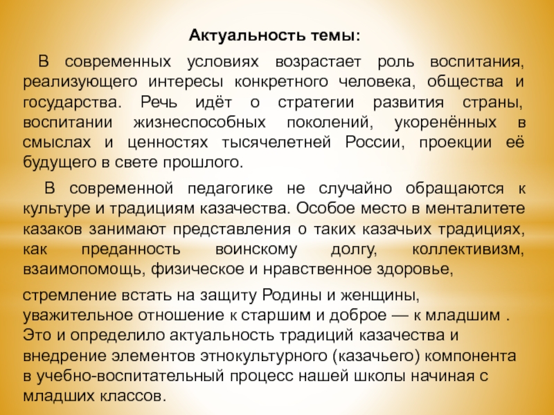 В современной педагогике не случайно обращаются к культуре и традициям казачества. Особое место в менталитете казаков занимают представления о таких казачьих традициях, как преданность воинскому долгу, коллективизм, взаимопомощь, физическое и нравственное здоровье,