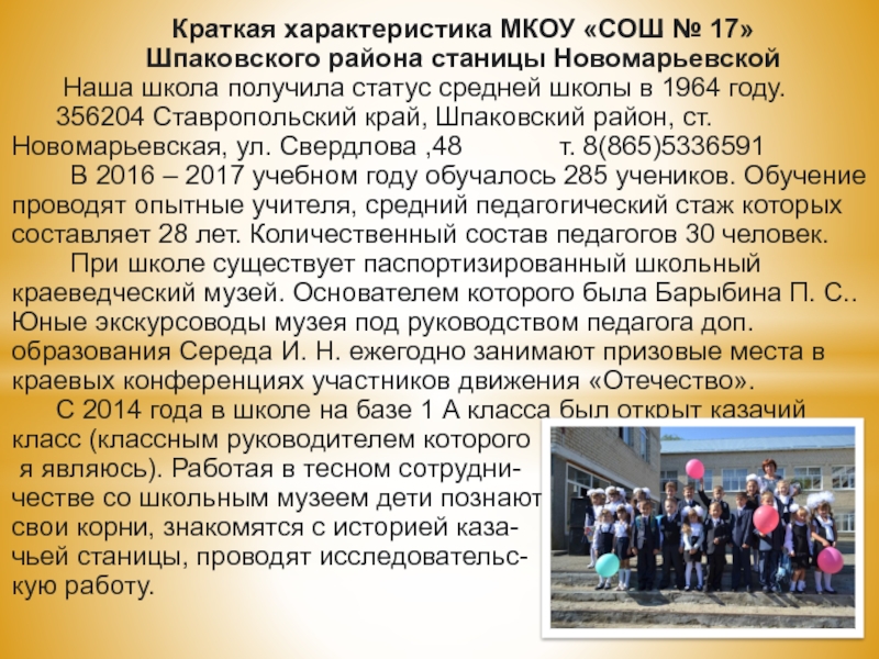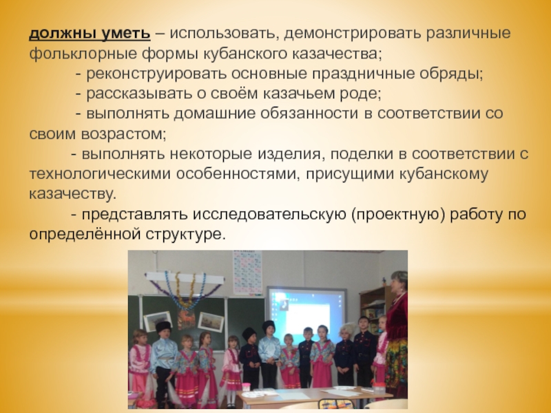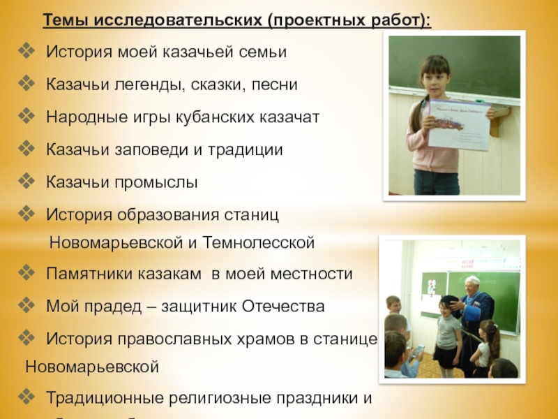 стремление встать на защиту Родины и женщины, уважительное отношение к старшим и доброе — к младшим . Это и определило актуальность традиций казачества и внедрение элементов этнокультурного (казачьего) компонента в учебно-воспитательный процесс нашей школы начиная с младших классов.