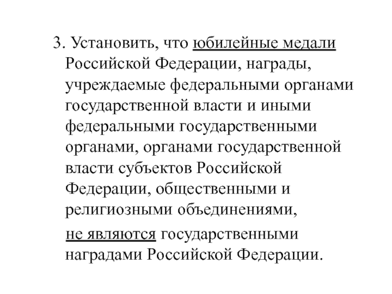 3. Установить, что юбилейные медали Российской Федерации, награды, учреждаемые федеральными органами