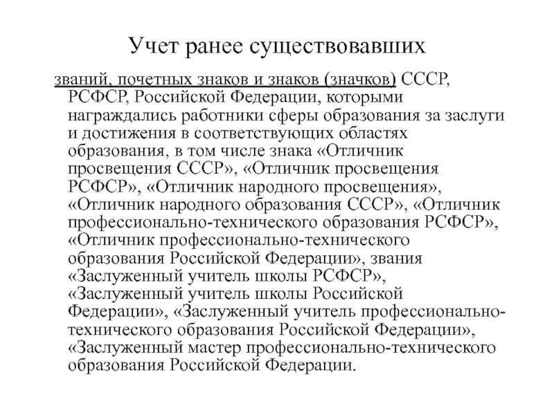 СССР, РСФСР, Российской Федерации, которыми награждались работники сферы образования за заслуги и достижения в соответствующих областях образования, в том числе знака «Отличник просвещения СССР», «Отличник просвещения РСФСР», «Отличник народного просвещения», «Отличник народного образования СССР», «Отличник профессионально-технического образования РСФСР», «Отличник профессионально-технического образования Российской Федерации», звания «Заслуженный учитель школы РСФСР», «Заслуженный учитель школы Российской Федерации», «Заслуженный учитель профессионально-технического образования Российской Федерации», «Заслуженный мастер профессионально-технического образования Российской Федерации.
