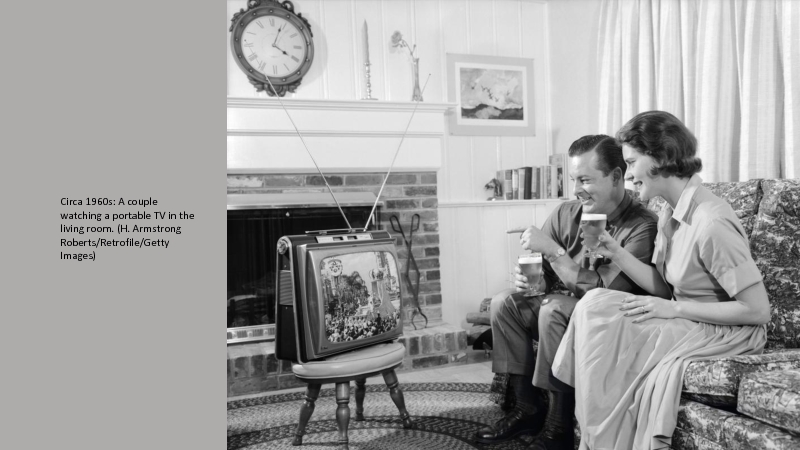 Слайд 8Circa 1960s: A couple watching a portable TV in the living