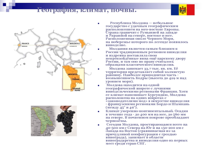 Европы. Страна граничит с Румынией на западе и Украиной на севере, востоке и юге. Расположенная около Черного Моря, на побережье которого по легенде появилось виноделие.