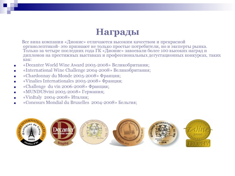 и прекрасной органолептикой- это признают не только простые потребители, но и эксперты рынка. Только за четыре последних года ГК «Дионис» завоевали более 100 высоких наград и дипломов на престижных выставках и профессиональных дегустационных конкурсах, таких как: