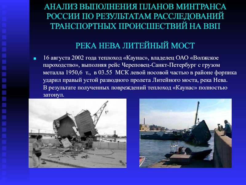 16 августа 2002 года теплоход «Каунас», владелец ОАО «Волжское пароходство», выполняя рейс Череповец-Санкт-Петербург с грузом металла 1950,6 т., в 03.55 МСК левой носовой частью в районе форпика ударил правый устой разводного пролета Литейного моста, река Нева. В результате полученных повреждений теплоход «Каунас» полностью затонул.