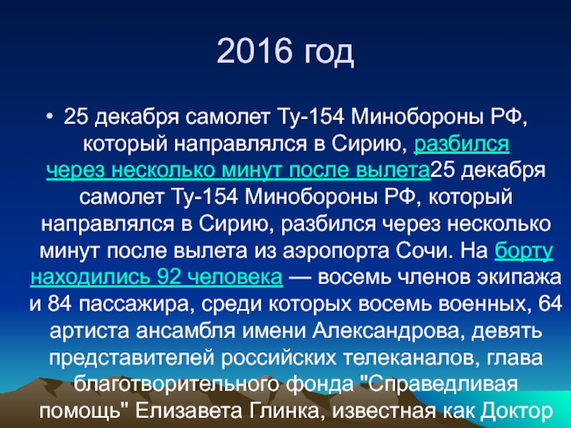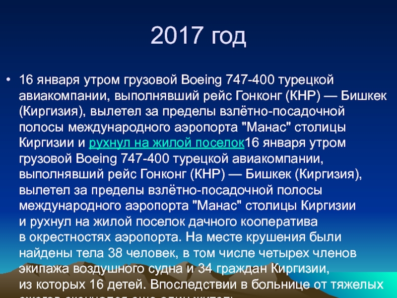 Ежегодно случается около 60 авиакатастроф. В 60 % гибнут все пассажиры и екипаж. Среднее число жертв ежегодно составляет около 2000чел..