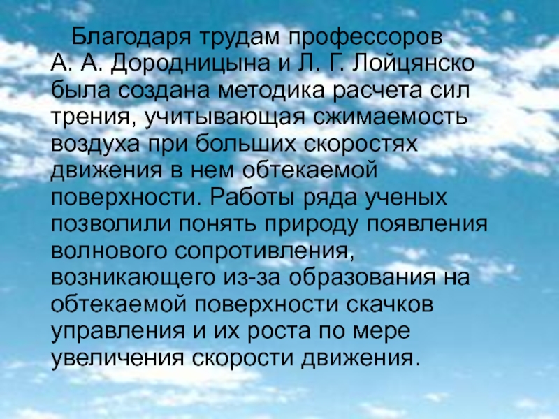 А. А. Дородницына и Л. Г. Лойцянско была создана методика расчета сил трения, учитывающая сжимаемость воздуха при больших скоростях движения в нем обтекаемой поверхности. Работы ряда ученых позволили понять природу появления волнового сопротивления, возникающего из-за образования на обтекаемой поверхности скачков управления и их роста по мере увеличения скорости движения.