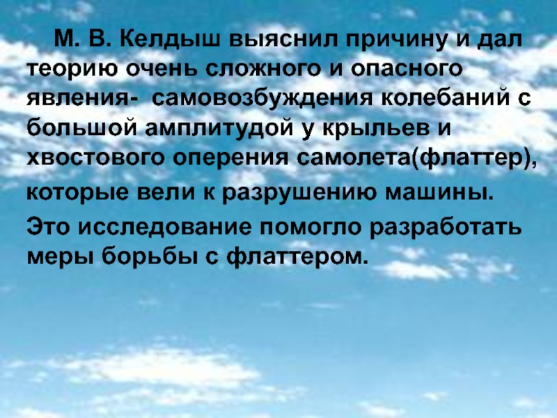 теорию очень сложного и опасного явления- самовозбуждения колебаний с большой амплитудой у крыльев и хвостового оперения самолета(флаттер),