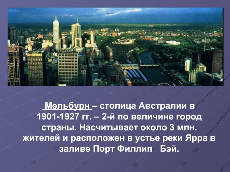 по величине город страны. Насчитывает около 3 млн. жителей и расположен в устье реки Ярра в заливе Порт Филлип Бэй.