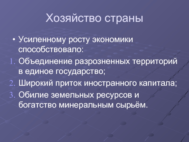 Обилие земельных ресурсов и богатство минеральным сырьём.