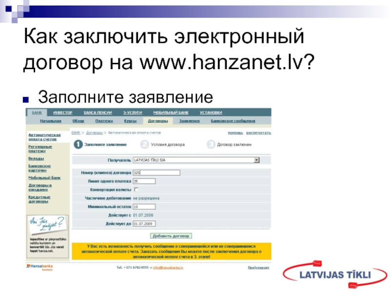 возможность автоматически оплачивать счета, выставляемые Вам нашей компанией. Используя предлагаемую услугу, Вы избавите себя от необходимости ежемесячно ходить в банк, для того, чтобы оплатить свои счета. Банк автоматически будет оплачивать счета, снимая нужную сумму с вашего банковского счета, в соответствии с присланной „LATVIJAS TĪKLI” квитанцией .