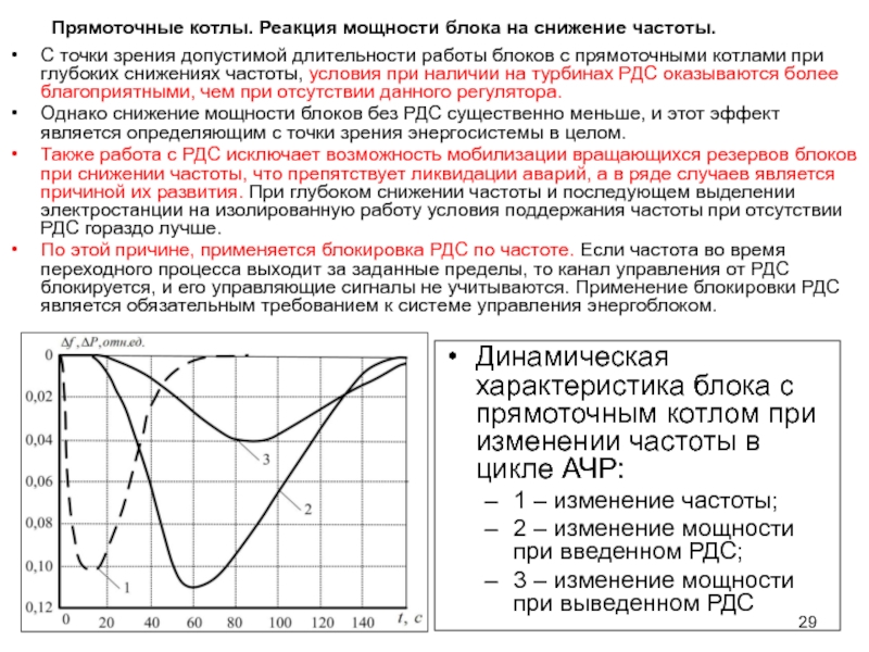 Слайд 29Прямоточные котлы. Реакция мощности блока на снижение частоты.