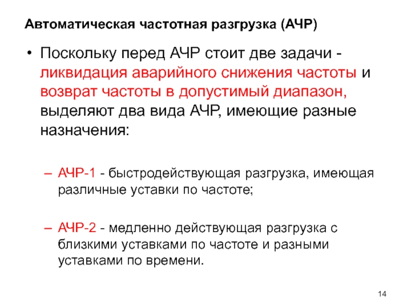аварийного снижения частоты и возврат частоты в допустимый диапазон, выделяют два вида АЧР, имеющие разные назначения: