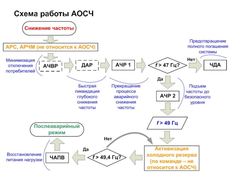 АОСЧ обеспечивает выполнение указанных требований за счет использования резервов генерирующей мощности и отключения нагрузки потребителей. При этом мощность отключаемой нагрузки не должна превышать возникший аварийный дефицит мощности.