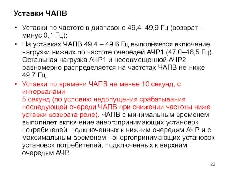 Устройства АЧВР должны действовать на АЗГ при снижении частоты в энергосистеме до значений 49,4–49,7 Гц.