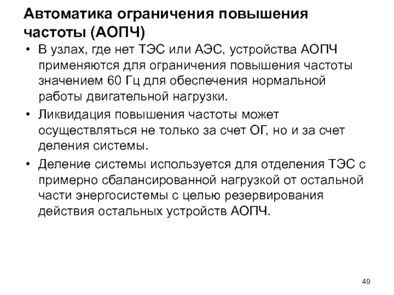 Слайд 49Автоматика ограничения повышения частоты (АОПЧ)