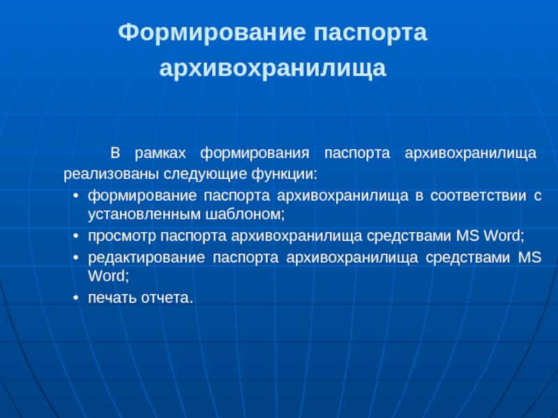 формирование паспорта архивохранилища в соответствии с установленным шаблоном;