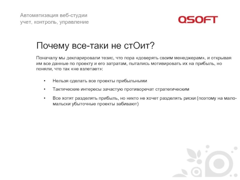 Все хотят разделять прибыль, но никто не хочет разделять риски (поэтому на мало-мальски убыточные проекты забивают)