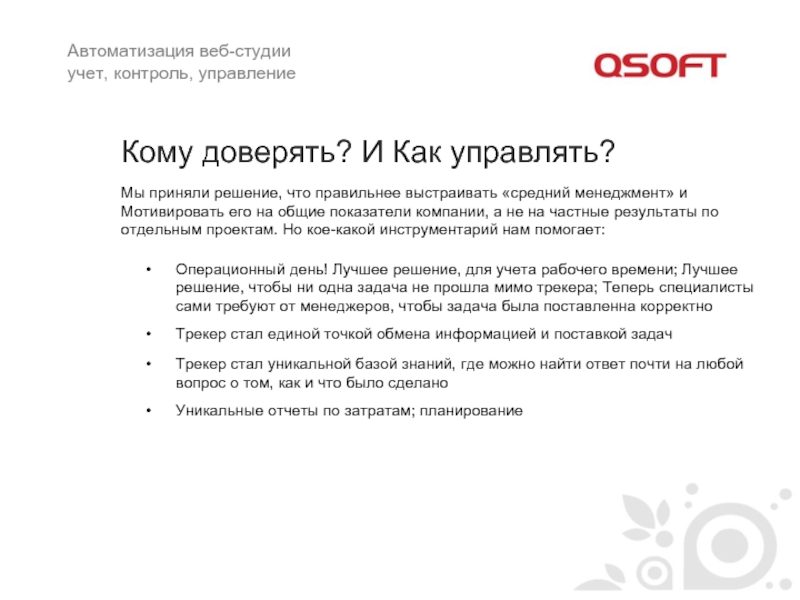 Операционный день! Лучшее решение, для учета рабочего времени; Лучшее решение, чтобы ни одна задача не прошла мимо трекера; Теперь специалисты сами требуют от менеджеров, чтобы задача была поставленна корректно