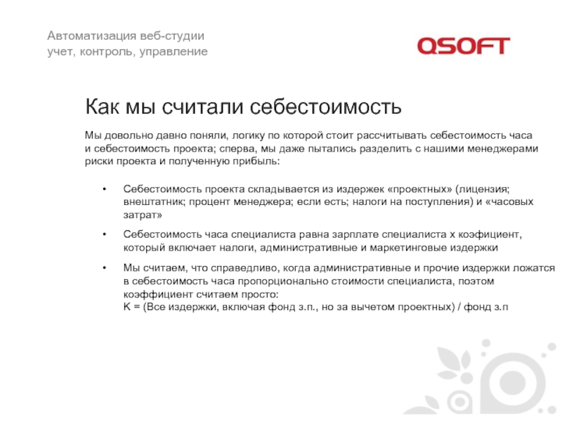 Себестоимость часа специалиста равна зарплате специалиста х коэфициент, который включает налоги, административные и маркетинговые издержки