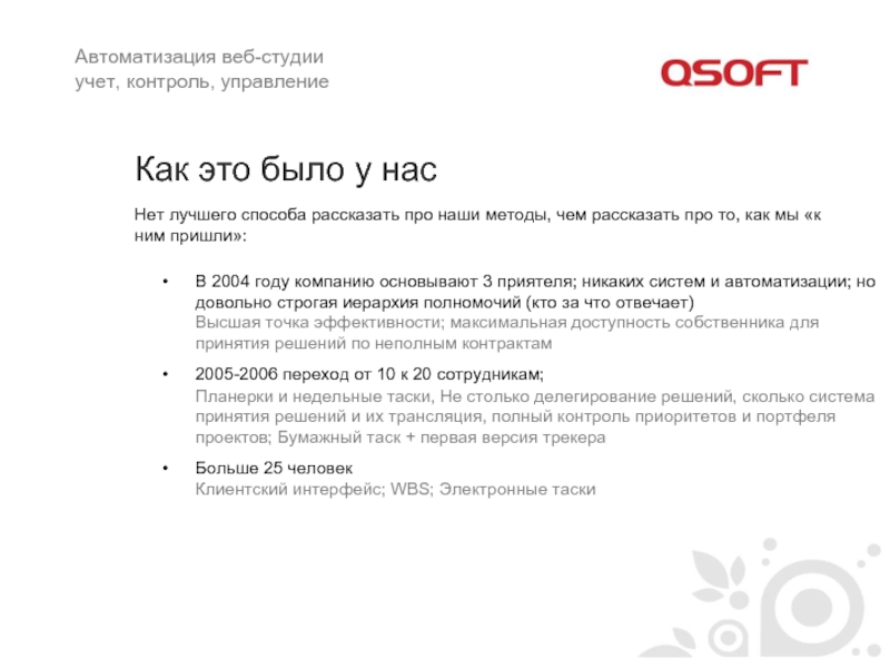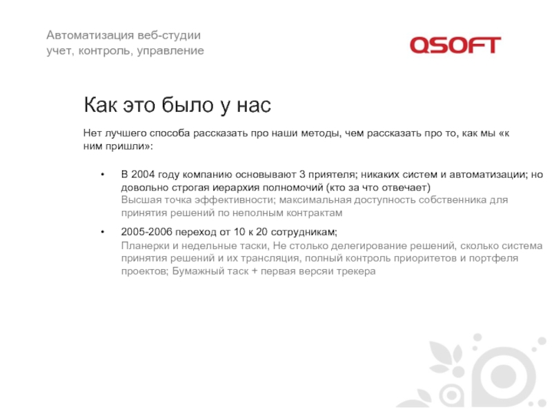 В 2004 году компанию основывают 3 приятеля; никаких систем и автоматизации; но довольно строгая иерархия полномочий (кто за что отвечает)
