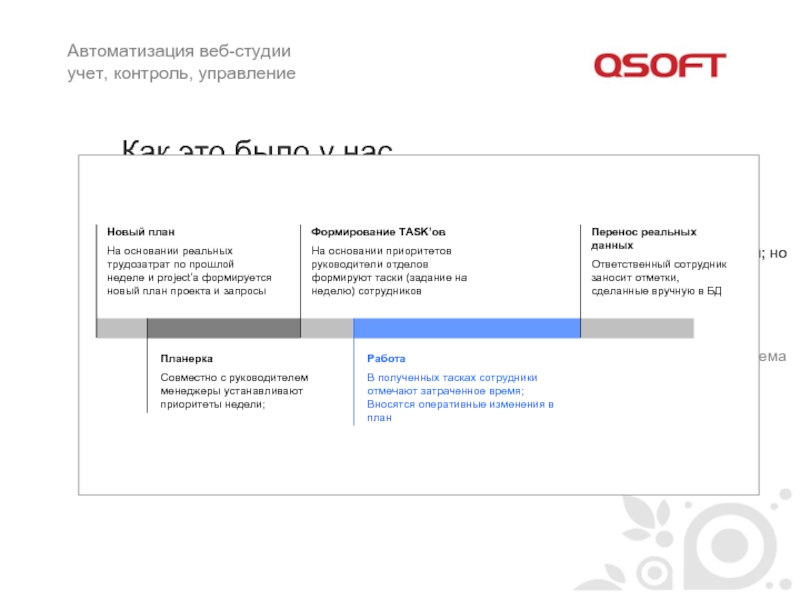 Планерки и недельные таски, Не столько делегирование решений, сколько система принятия решений и их трансляция, полный контроль приоритетов и портфеля проектов; Бумажный таск + первая версия трекера