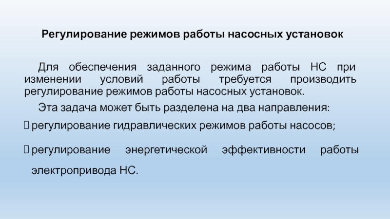 изменении условий работы требуется производить регулирование режимов работы насосных установок.