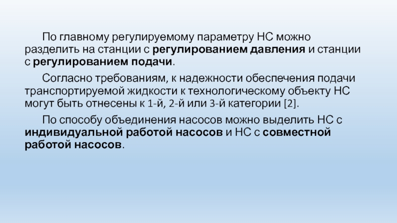 Согласно требованиям, к надежности обеспечения подачи транспортируемой жидкости к технологическому объекту НС могут быть отнесены к 1-й, 2-й или 3-й категории [2].