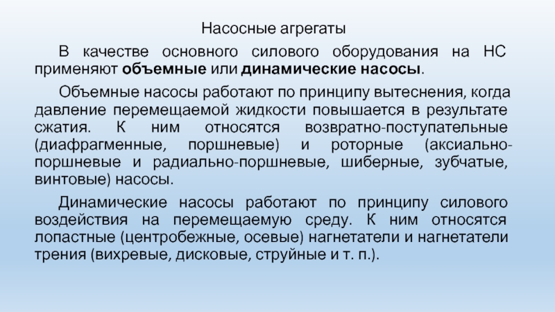 Динамические насосы работают по принципу силового воздействия на перемещаемую среду. К ним относятся лопастные (центробежные, осевые) нагнетатели и нагнетатели трения (вихревые, дисковые, струйные и т. п.).