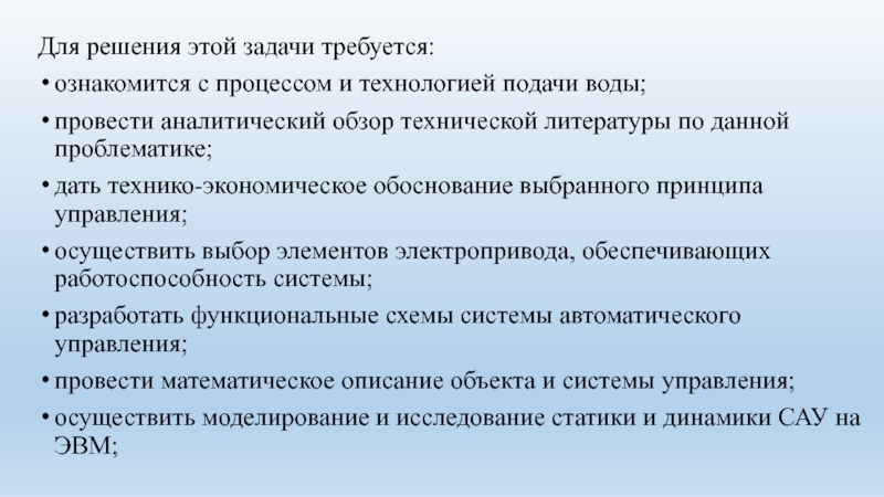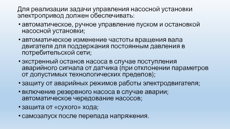 Слайд 9Для реализации задачи управления насосной установки электропривод должен обеспечивать: