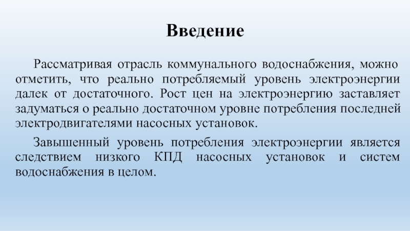 Завышенный уровень потребления электроэнергии является следствием низкого КПД насосных установок и систем водоснабжения в целом.