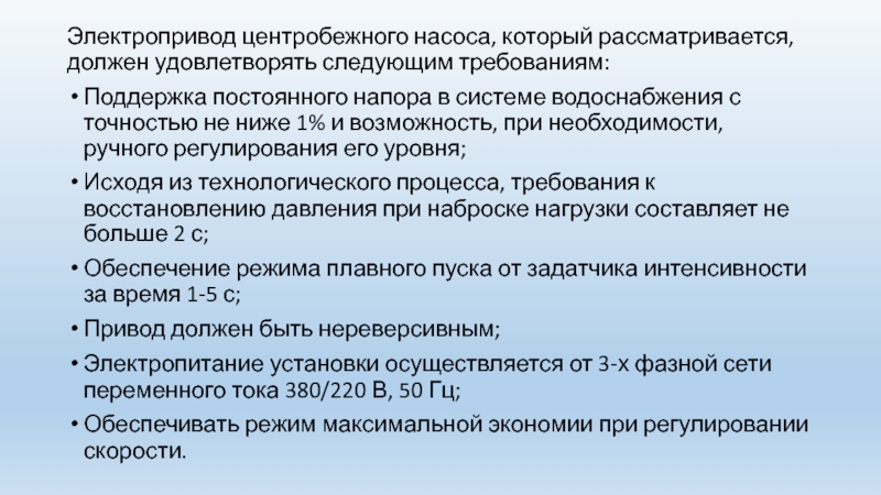 Слайд 7Электропривод центробежного насоса, который рассматривается, должен удовлетворять следующим требованиям: