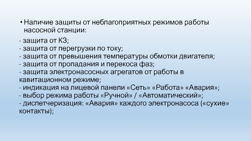 Слайд 8Наличие защиты от неблагоприятных режимов работы насосной станции: