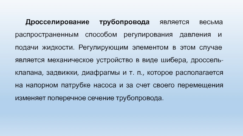 Слайд 19Дросселирование трубопровода является весьма распространенным способом регулирования давления и подачи жидкости.