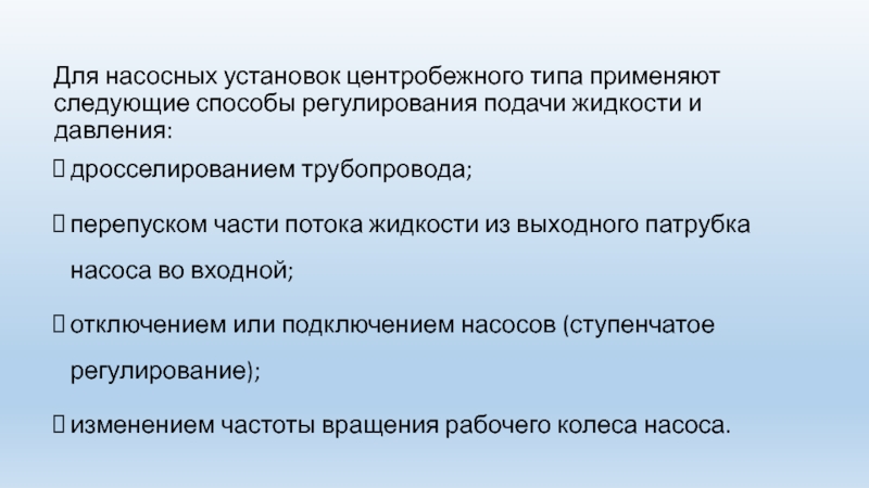 Слайд 18Для насосных установок центробежного типа применяют следующие способы регулирования подачи жидкости