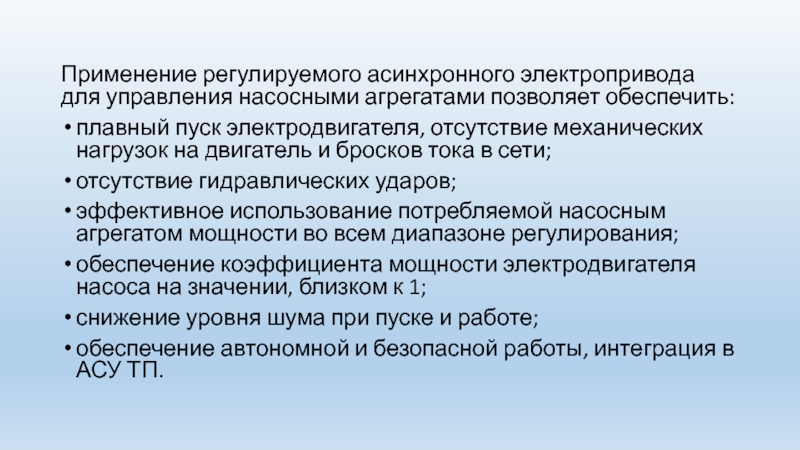 Слайд 6Применение регулируемого асинхронного электропривода для управления насосными агрегатами позволяет обеспечить: