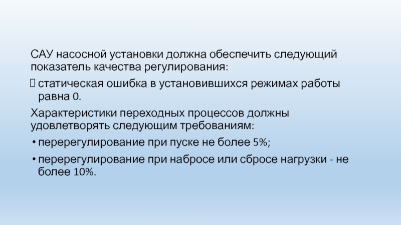 Слайд 10САУ насосной установки должна обеспечить следующий показатель качества регулирования: