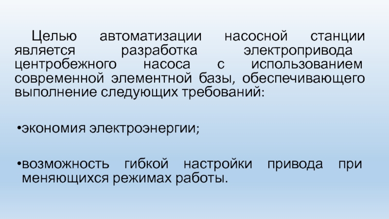 Слайд 3Целью автоматизации насосной станции является разработка электропривода центробежного насоса с использованием